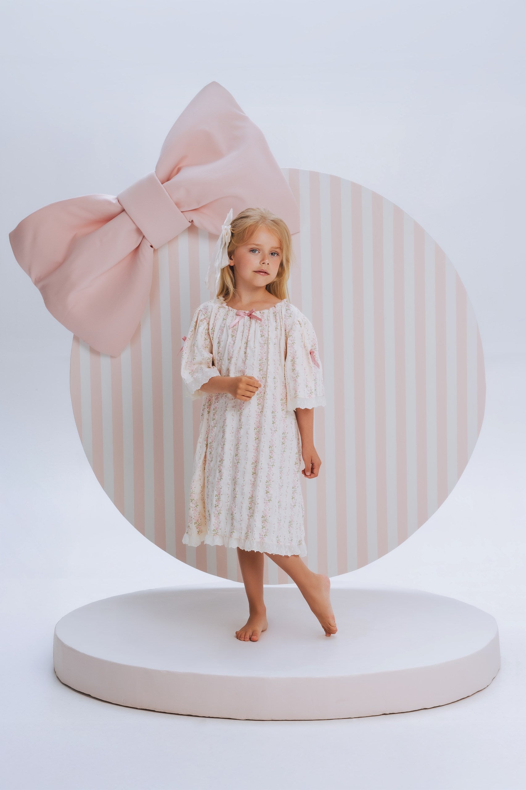 Charming girls' nightdress Airiin features vintage-inspired short sleeves with lace details as well as decorative bow on the front.