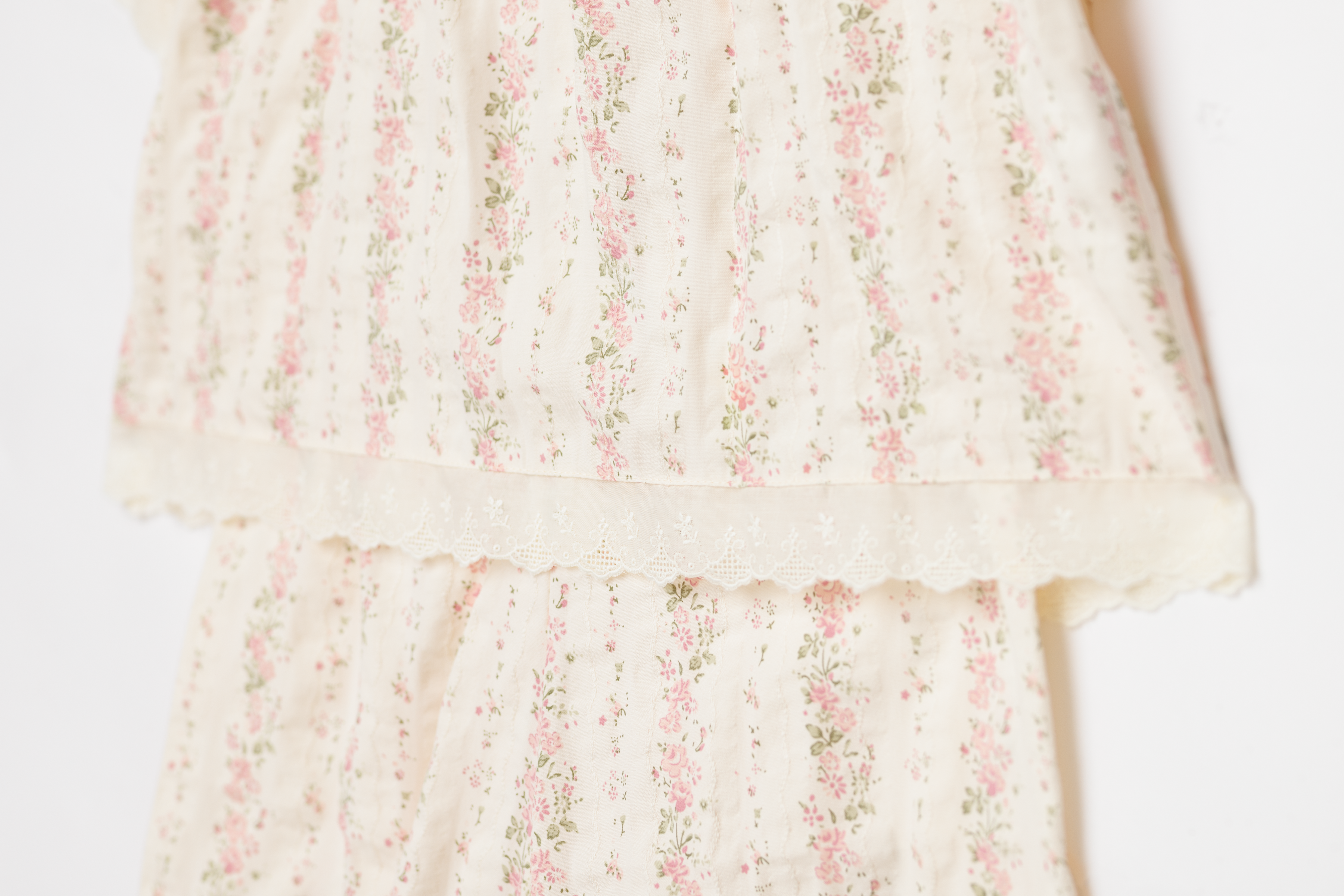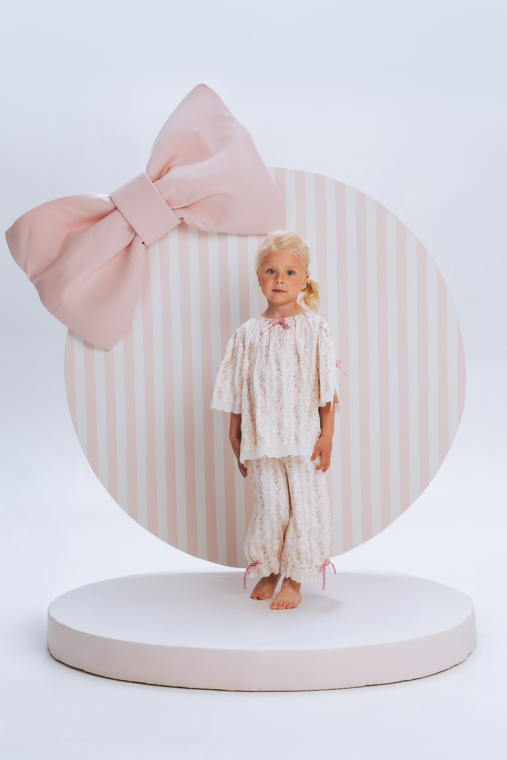Charming girls' pyjama Arleta features vintage-inspired short sleeves with lace details as well as decorative bow on the front.